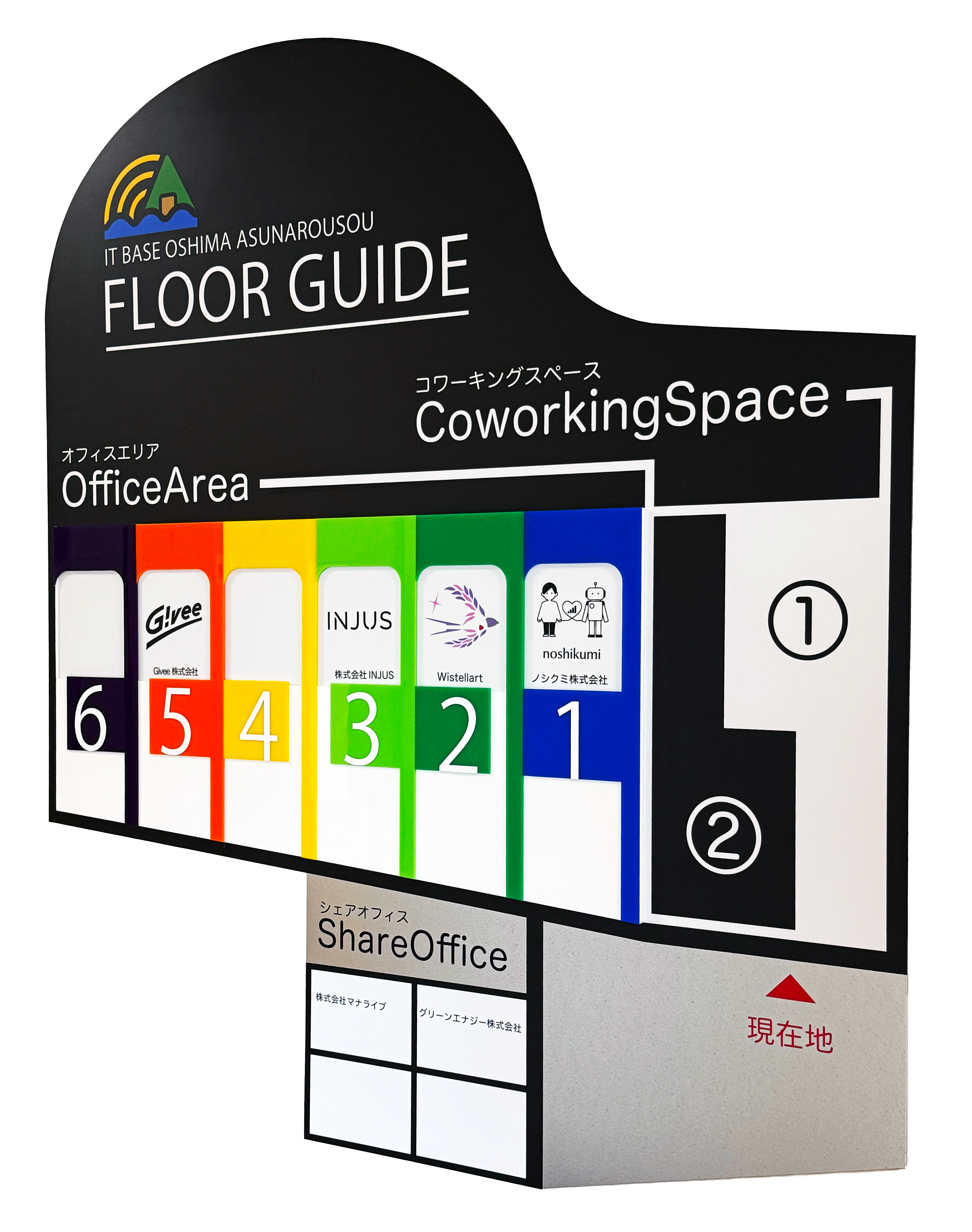 設置できる壁面の幅が限られていたため、横長の構造のフロアマップをどのようにコンパクトにまとめて上でデザイン性を保持する点を工夫しました。